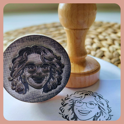 Wij maken een unieke ronde stempel (Ø 40 mm) met een illustratie op basis van jouw foto. Perfect voor bijvoorbeeld een afscheid, verjaardag of als bedankje aan het einde van het schooljaar.