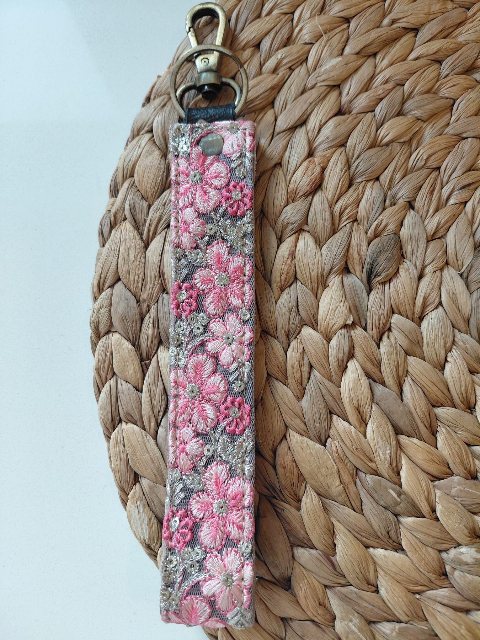Deze schitterende sleutelhanger is met liefde en vakmanschap gemaakt in India. Hij combineert prachtig leer met een bloemenmotief en geborduurde stof. Met de stevige metalen karabijnhaak bevestig je hem moeiteloos aan je tas of sleutelbos.