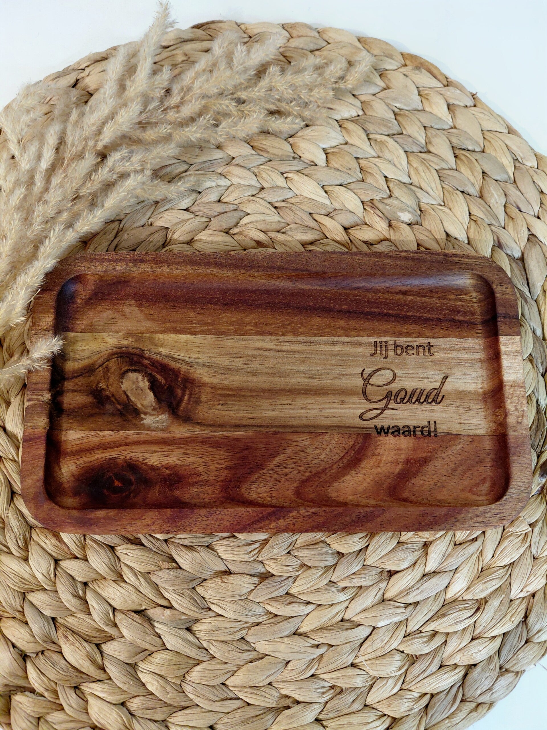 Deze acacia houten plank is met zorg afgewerkt en daardoor niet alleen praktisch, maar ook een echte eyecatcher op tafel. Combineer de plank met onze unieke gegraveerde mokken voor een persoonlijk en bijzonder serveersetje.