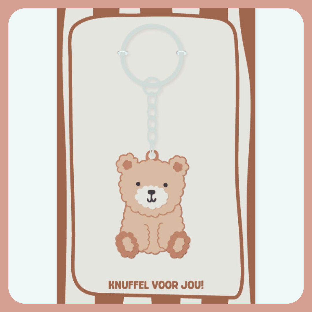 Schattige bruin/beige PVC 2D beertjes sleutelhanger. Wordt geleverd met bijpassend kaartje ‘Knuffel voor jou’. Leuk voor kinderen, tieners, als kraamcadeau of liefhebbers van cute accessoires. Praktisch, speels en een klein cadeautje dat dagelijks plezier brengt.